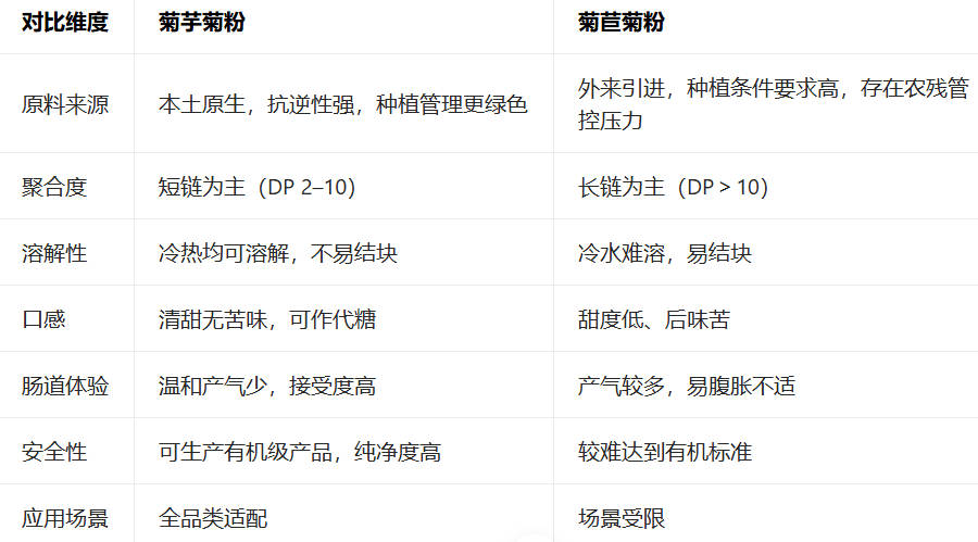 菊芋菊粉溶解性好、口感清爽、稳定性强,可广泛用于食品、保健品、婴幼儿食品、固体饮料、烘焙制品等领域;菊苣菊粉受溶解性与口感限制,适用场景相对有限。